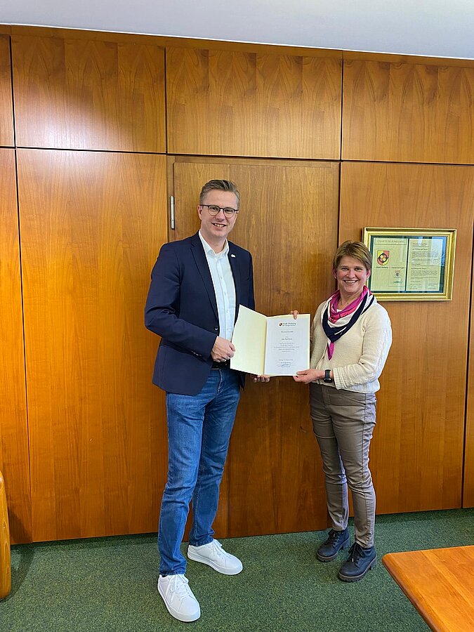 Nach ihrer Ausbildung bei der Stadt Olsberg begann die Assinghauserin zunächst in verschiedenen Funktionen innerhalb der Stadtverwaltung, bevor sie im Jahr 2001 in die Schulsekretariate wechselte. Bürgermeister Patrick Potthoff dankte ihr im Rahmen einer kleinen Feierstunde zu ihrem Dienstjubiläum mit einer Urkunde für ihre langjährige engagierte Arbeit.