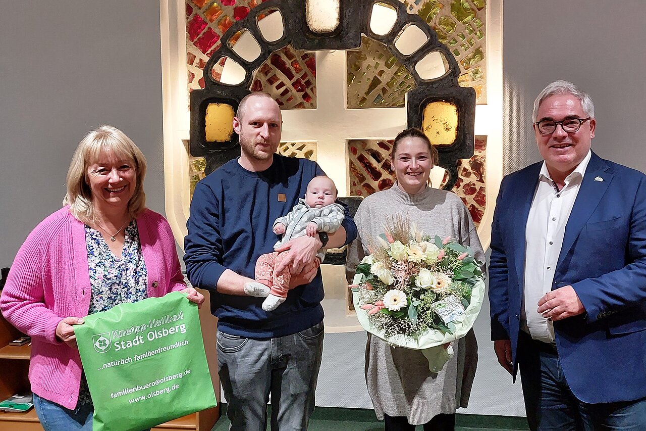 Zusammengefasst sind sie im Babybegrüßungspaket, das alle Eltern im Stadtgebiet bei der Geburt eines Kindes erhalten. Julia und Lars Kinzel bekamen jetzt das 1500. Babybegrüßungspaket – im Oktober 2009 wurde die „erste Ausgabe“ überreicht. „Eine tolle Geschichte“, freut sich Bürgermeister Fischer – von vielen Eltern gebe es die Rückmeldung, wie wichtig die Informationen seien, welche die Stadt Olsberg für junge Eltern in dem Paket geschnürt hat: eine Liste mit wichtigen Adressen und Informationen zu Wickelmöglichkeiten im Stadtgebiet, eine Broschüre zur Entwicklung von Babys im ersten Lebensjahr, Flyer mit Informationen zum Baby-Café und von Kindertageseinrichtungen, Familienzentren und Tagespflegeeinrichtungen sowie ein Paar Söckchen von einem lokalen Kinderbekleidungsgeschäft. Nicht fehlen dürfen ein Begrüßungsbrief des Bürgermeisters sowie ein Flyer des Familienbüros.