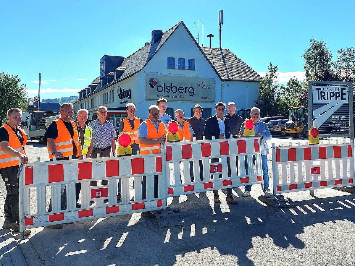 Im Beisein von Projektbeteiligten, Vertretern der Firma Olsberg, Straßen.NRW und Anliegern öffnete Bürgermeister Wolfgang Fischer die wichtige Straßenverbindung. Mit dem 2. Bauabschnitt ist in diesem Jahr ein rund 200 Meter langer Straßenabschnitt komplett erneuert worden, nachdem bereits im Vorjahr rund 450 Meter der Hüttenstraße saniert und umgestaltet worden waren.