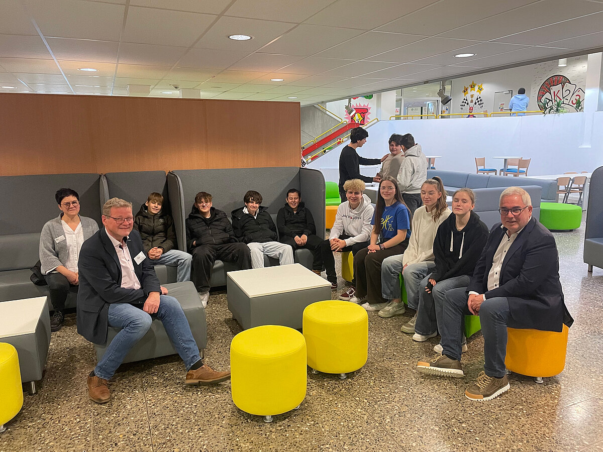 Olsbergs Bürgermeister Wolfgang Fischer ließ es sich nicht nehmen, die neuen Ganztagsmöbel im Foyer und die neuen Spielgeräte auf dem Pausenhof zu begutachten. Schulleiter Michael Aufmkolk begrüßte die Gäste herzlich und erklärte in einem kurzen Vortrag die Besonderheiten der Sekundarschule, wie das Kurssystem und die verschiedenen erreichbaren Abschlüsse.