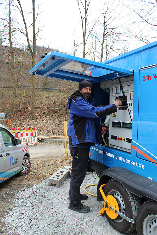 Die neue Technik hat sich bereits bewährt: Erstmals wurden sowohl ein Notstromaggregat als auch die mobile Druckerhöhungsanlage bei den Bauarbeiten an der Pumpstation Ulmecker Siepen in Meschede eingesetzt, um dort während der Umbaumaßnahmen eine unterbrechungsfreie Trinkwasserversorgung sicherzustellen.