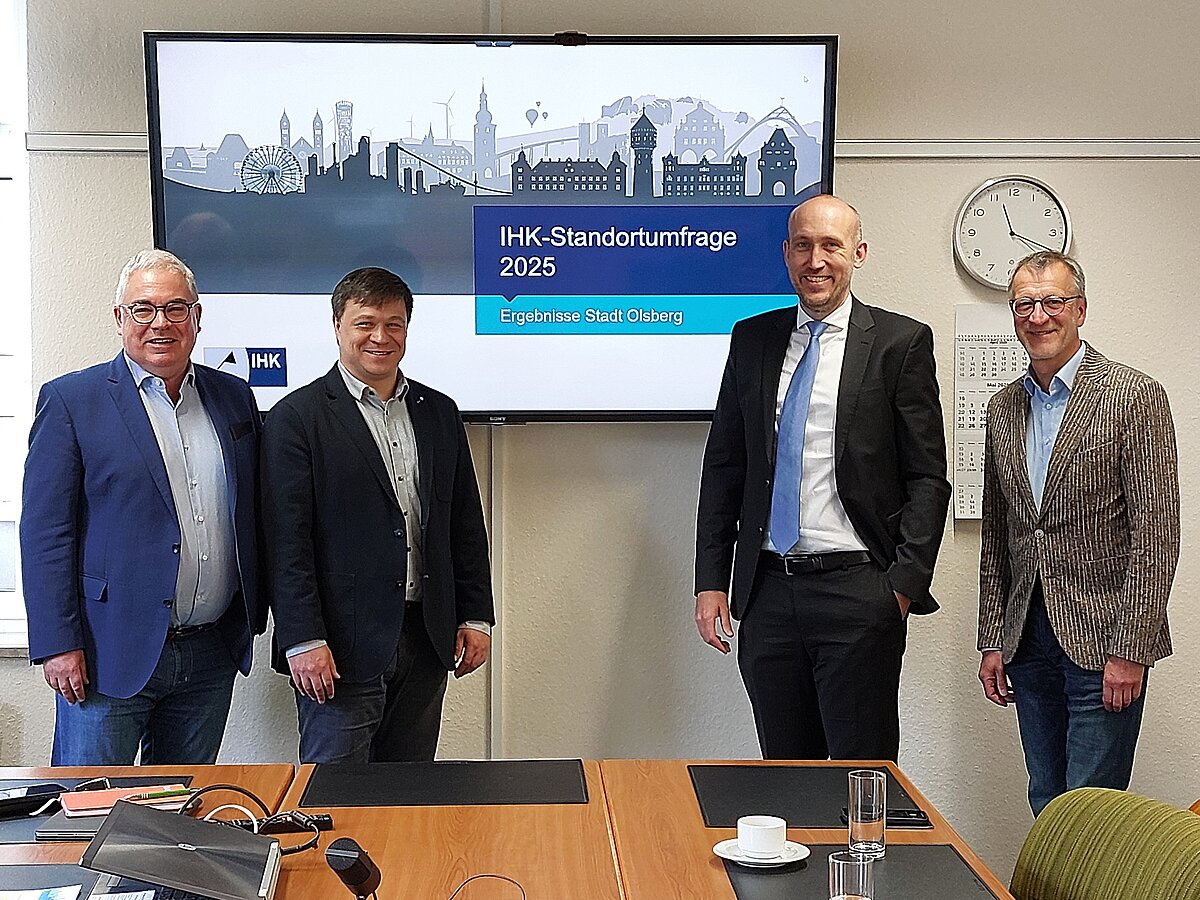 Olsberg. Die zahlreichen Einkaufsmöglichkeiten – in den Geschäften der Fachwelt Olsberg oder im Lebensmittel-Einzelhandel – sind ein „Pfund“, mit dem die Stadt Olsberg bei ihren heimischen Unternehmen wuchern kann. Das ist ein Ergebnis der Standortumfrage, welche die IHK Arnsberg – Hellweg-Sauerland unter ihren Mitgliedsbetrieben durchgeführt hat. Die Ergebnisse für den Bereich der Stadt Olsberg stellten jetzt IHK-Hauptgeschäftsführer Jörg Nolte und Thomas Frye, Geschäftsbereichsleiter Standort – Branchen – Unternehmensförderung, im Olsberger Rathaus Bürgermeister Wolfgang Fischer und dem städtischen Wirtschaftsförderer Olaf Karte vor.