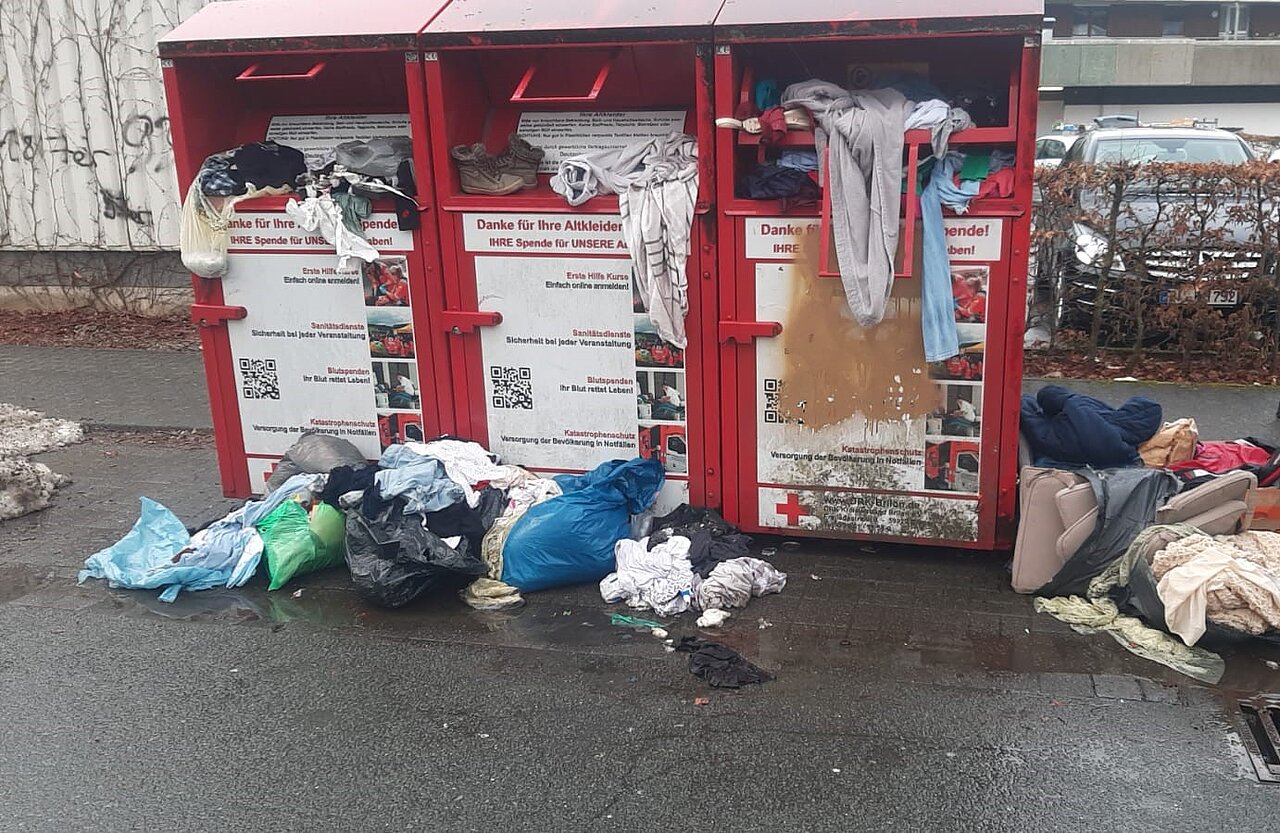 Die Situation ist mehr als ärgerlich – nicht nur der Anblick, sondern auch der zusätzliche Aufwand: An einigen Standorten in der Kernstadt kann der Bauhof bei der Reinigung der ständigen Vermüllung kaum noch nachkommen. Sobald die Standorte gereinigt sind, wird kurze Zeit später schon wieder Abfall abgelagert. Bei gefüllten Containern werden die Altkleidersäcke einfach vor oder neben den Altkleidercontainern abgestellt. Diese abgestellten Säcke und andere Abfälle werden dann wiederum vom Bauhof als Restmüll entsorgt. Auch neben Altglascontainern wird immer häufiger Müll illegal abgeladen.