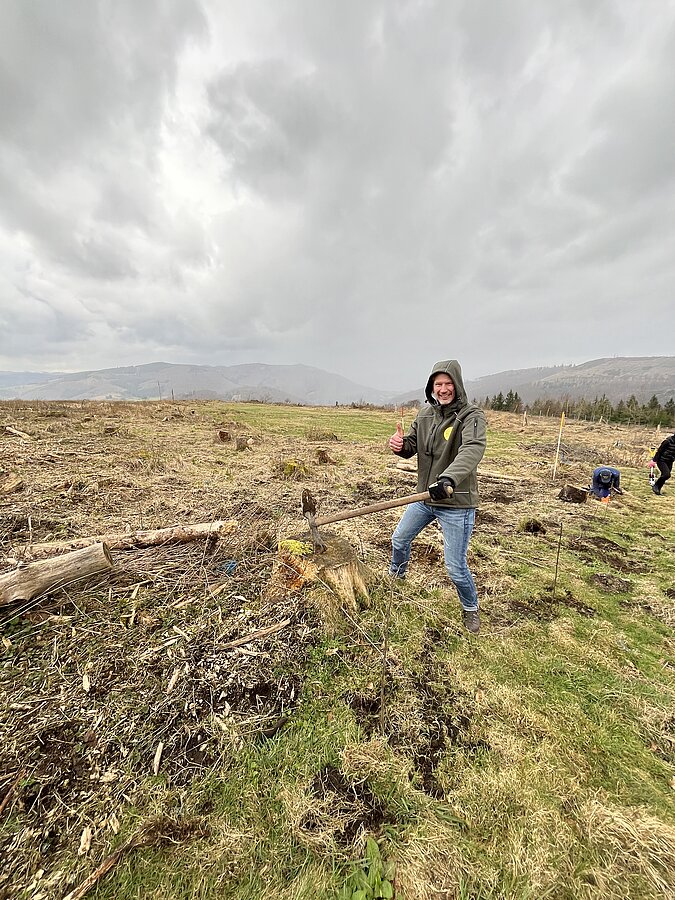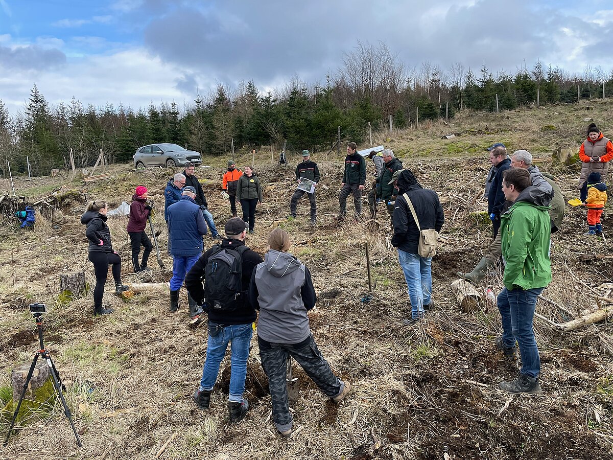 Mit rund 30 Teilnehmern – darunter auch Olsbergs Bürgermeister Wolfgang Fischer und Vertretern der Volksbank Sauerland eG, die die Schirmherrschaft des WaldLokals Olsberg übernommen hat, - konnte die erste Aufforstung am Habbergskopp in Elleringhausen in Angriff genommen werden. An diesem Tag wurden knapp 200 Setzlinge von den Spendern selbst gepflanzt.