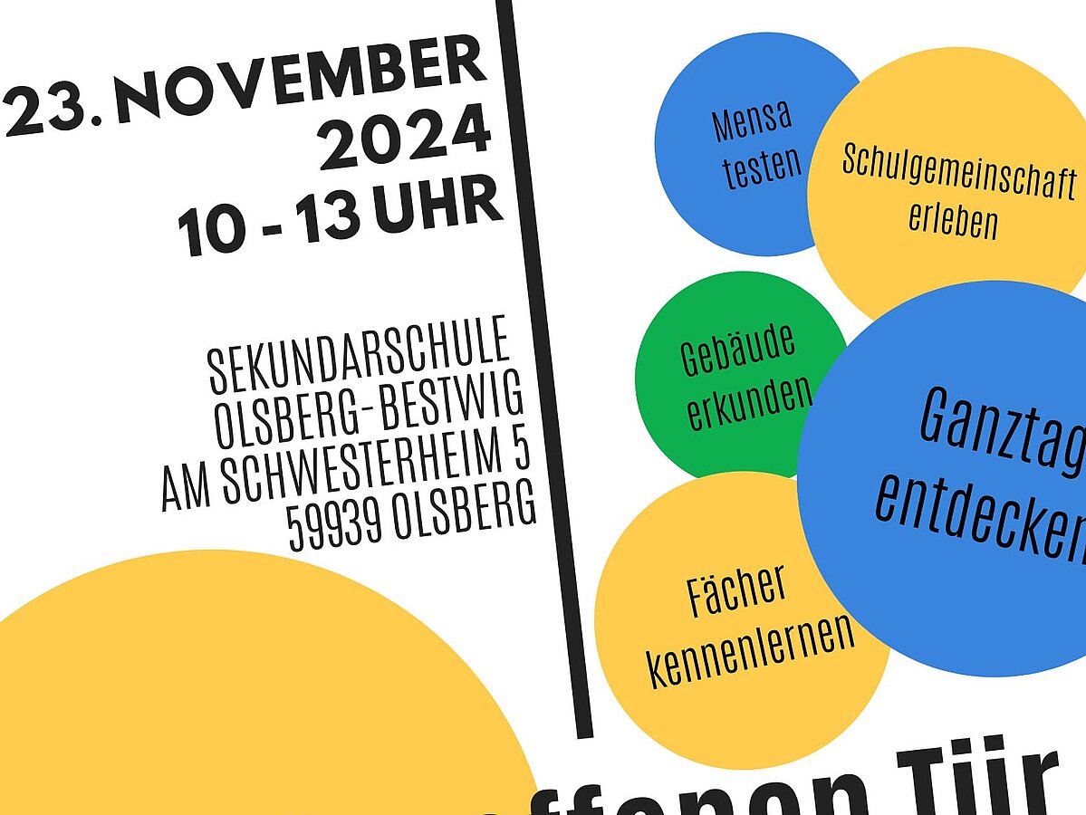 Olsberg. Die Sekundarschule Olsberg-Bestwig lädt erstmalig wieder an einem Samstagvormittag zu einem Tag der Offenen Tür ein. Am Samstag, 23. November, werden Bürgermeister Wolfgang Fischer und Schulleiter Michael Aufmkolk um 10 Uhr die Besucher in der Aula in Olsberg begrüßen. Eingeladen sind alle interessierten Eltern, Schüler und Schülerinnen, insbesondere natürlich die des jetzigen 4. Schuljahres in den Grundschulen der Stadt Olsberg und der Gemeinde Bestwig.