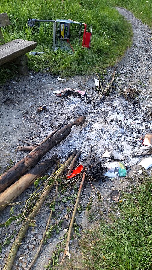 Über Vandalismus ärgern sich viele Olsbergerinnen und Olsberger derzeit, die den Tatort im unteren Drittel der Ruhrauen in Olsberg sehen: Sieben frische gepflanzte Obstbäume wurden dort abgebrochen, die Pfähle, die die Bäume halten sollten, herausgerissen und gemeinsam mit Verpackungsabfällen an einer Sitzbank verbrannt. Die Verpackungsabfälle wurden mit einem Einkaufswagen transportiert, der ebenfalls vor Ort verblieben ist. Geschehen ist dies in der Nacht vom 30. April auf den 1. Mai.