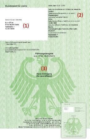 Als u een verklaring van goed gedrag moet voorleggen aan een Duitse instantie, moet u dit vermelden bij het indienen van uw aanvraag. De verklaring van goed gedrag wordt dan door het Federale Bureau van Justitie rechtstreeks naar de autoriteit (en niet naar de aanvrager) gestuurd. In dit geval zijn het exacte postadres van de verzoekende autoriteit en een referentienummer vereist. De aanvrager kan vragen dat het bewijs van goed gedrag, indien het vermeldingen bevat, voor inspectie naar een door hem te bepalen lokale rechtbank wordt gestuurd.